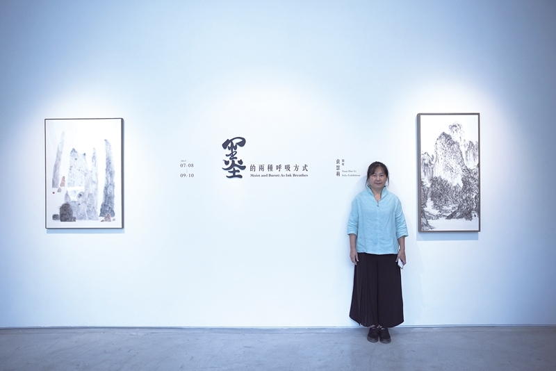 「火墨」之外,新個展「墨的兩種呼吸方式」的另一重點是與之對比的水墨作品—「孤山水」與「時間之漬」兩個系列,呈現水墨畫淡沱淋漓的特質,作為「潤」墨的寫照。前者塊狀風格既象徵畫家長年居於山邊海際、多霧空景的金山生活寫照,也象徵台灣島的地理現狀與政治處境。簡筆淡墨盡顯北台灣溼潤氣候與空濛畫面。同時,一如「火墨」實驗精神,「孤山水」也以不同材質與技法來抒展墨性與紙性之間的微妙差異。後者則是以長時間千點萬筆、層疊皴染的「積墨」,表現蟬翼熟宣積厚而薄的墨性與點漬交疊的層次空間狀態。袁慧莉表示,「兩個系列都表現出了似山似石、非山非石、得山復無山的形態與墨韻,以筆墨的簡與繁出入於精神的瞬間與複思、具形與去形的觀照,將『水墨』的墨性形態從自然山川場域轉化為情狀隱喻與物性美學。」