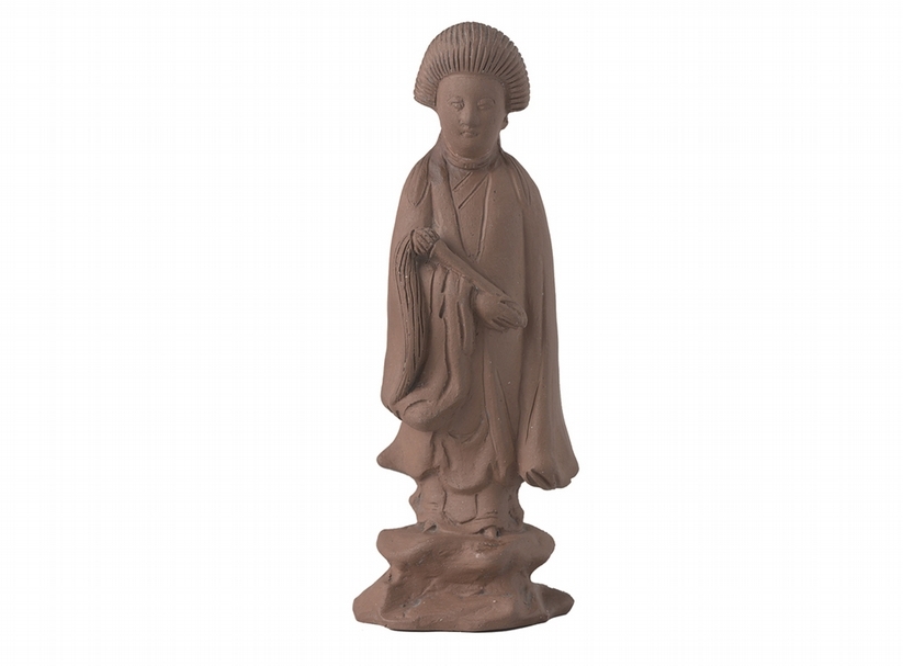 20世紀初日本漆藝大師白山松哉(1893~1923)所製的蒔繪書箱上,所描繪的觀音係根據近代日本畫之父狩野芳崖(1828~1888)的絕筆〈悲母觀音〉所作,漆匠以金、銀呈現華麗絢爛的強烈視覺魅力(圖8)。值得注意的是,在狩野芳崖的原作中,觀音的面部帶有鬍鬚,是以「男神」來表現,而在白山松哉在他的蒔繪書箱上,卻選擇以「女性」的形象來再現「悲母觀音」。除此之外,展覽還展出若干歐洲仿製的觀音像,例如18世紀上半的一件可能製於德國安斯巴赫(Ansbach)的錫釉陶器,在造型上明顯可辨是以福建德化窯的白瓷觀音像為典範(圖9);而另一件17世紀末至18世紀初由荷蘭德爾夫特(Delft)所製的觀音陶塑(圖10),則是以江蘇宜興的陶塑為典範,兩者皆代表了18世紀歐洲在成功燒造出瓷器之前對中國陶瓷的仿效與追求。