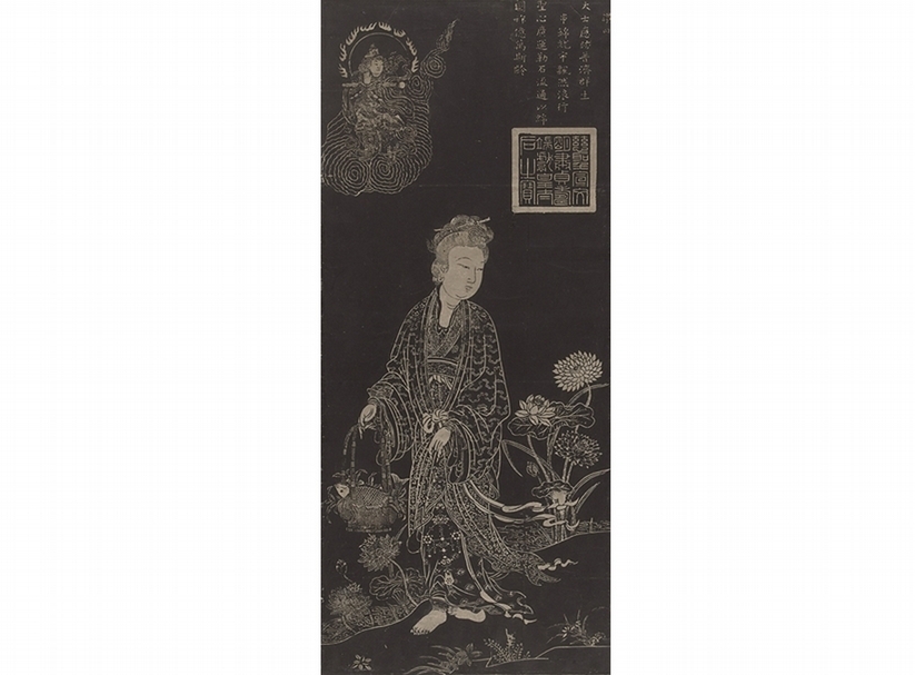 中國民間傳說觀音菩薩有許多的化身,「魚籃觀音」就是其中之一。有關「魚籃觀音」化現的故事,宋濂〈魚籃觀音像讚序〉曰:「予按《觀音感應傳》,唐元和十二年,陝右金沙灘上,有一美豔女子,挈籃鬻魚,人競欲室之。女曰:『妾能授經。一夕能誦《普品者》,事焉。』黎明能者二十。女辭曰:『一身豈堪配眾夫耶?請易《金剛經》。』如前期。能者復居其半。女又辭,請易《法華經》,期以三日。唯馬氏子能。女令具禮成婚。入門,女即死。死即麋爛立盡。遽瘞之。他日有僧同馬氏子,啟塚觀之。唯黃金鎖子骨存焉。僧曰:此觀音示現,以化汝耳。言訖,飛而去。自是陝西多誦經者。」故「魚籃觀音」又稱「馬郎婦觀音」。展出的一件碑拓,描繪的就是「魚籃觀音」的形象,上有「慈聖宣文明肅貞壽端獻皇太后之寶」印及贊文:「大士應跡,普濟眾生。串錦就市,飄然浪行。聖心廣運勒石流通,以綿國祚億萬斯齡。」說明此碑為明神宗之母,慈聖皇太后(1542~1614)所贊助(圖7)。孝定皇太后篤信佛教,北京市阜城門外八里,有慈壽寺,即慈聖皇太后出資,於萬曆四年(1578)二月開始修建,萬曆六年秋竣工。慈聖皇太后在修建的慈壽寺中,還建了一座九蓮閣,閣中供奉九蓮菩薩,時人更附會皇太后為九蓮菩薩轉生。據《明史.悼靈王傳》記載:「悼靈王慈煥,莊烈帝第五子。生五歲而病,帝視之,忽云:『九蓮菩薩言,帝待外戚薄,將盡殤諸子。』遂薨。九蓮菩薩者,神宗母,孝定李太后也。」