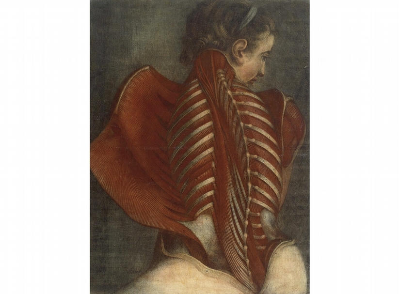 高迪埃.達勾堤Jacques-Fabien Gautier d’Agoty│「解剖學天使」從頸部切開至尾椎的女人的背 彩色版畫 67x50cm 1745 © Adagp, Paris 2016