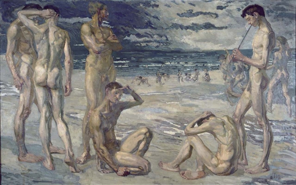 繪於1905年的《海邊的青年》(Young Men by the Sea)是貝克曼的第一件大尺寸畫作,乍看之下,似乎反映了他所接受的學院派人體養成,但拉長的人物和彷彿被剝了皮的肌肉則類似義大利文藝復興時期歐維也托(Orvieto)畫家路卡.辛祐瑞里(Luca Signorelli)的類型,例如作於1499-1504年的溼彩壁畫《遭譴的亡魂被扔到地獄》(The Damned Cast into Hell),然而,貝克曼的較為鬆散揮灑筆觸和輕快用色則是反映了印象派的影響。