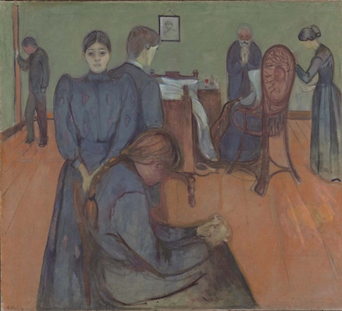 孟克《病房的死亡》 , 卵彩、蠟筆、畫布,152.5×169.5cm,約1893 。(挪威奧斯陸國家美術館提供)