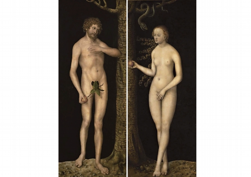老魯卡斯.克拉拿赫《亞當與夏娃》, 雙聯幅左右兩翼,油彩、木板,各137×54cm,約 1510-1520。(奧地利維也納藝術史美術館提供)