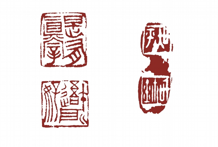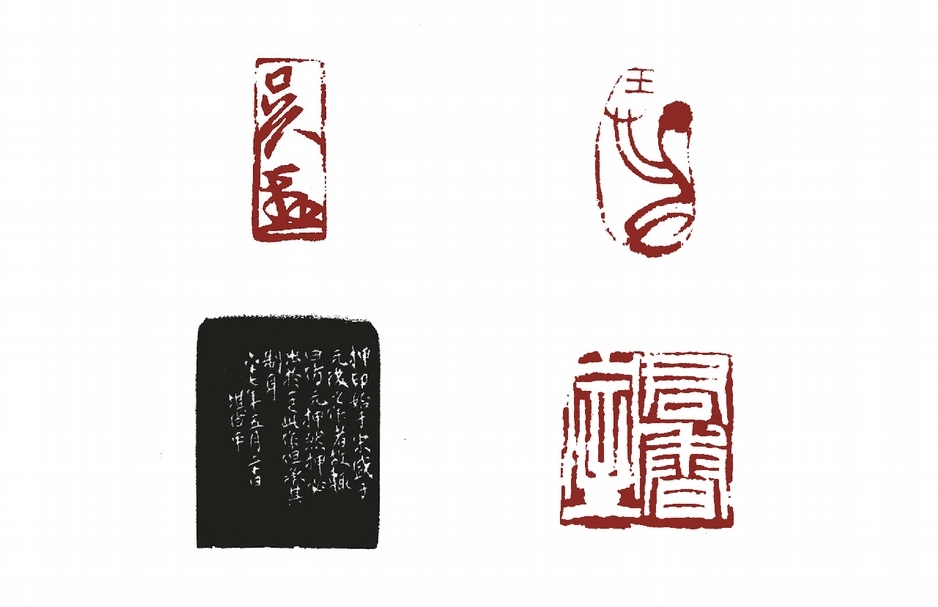 (左上)吳平〈是有真宰〉,3.8×3.2公分。(左下)吳平〈吾所好〉,3×3公分。(右)吳平〈吳平.信鈢〉,3.4×1.2公分。