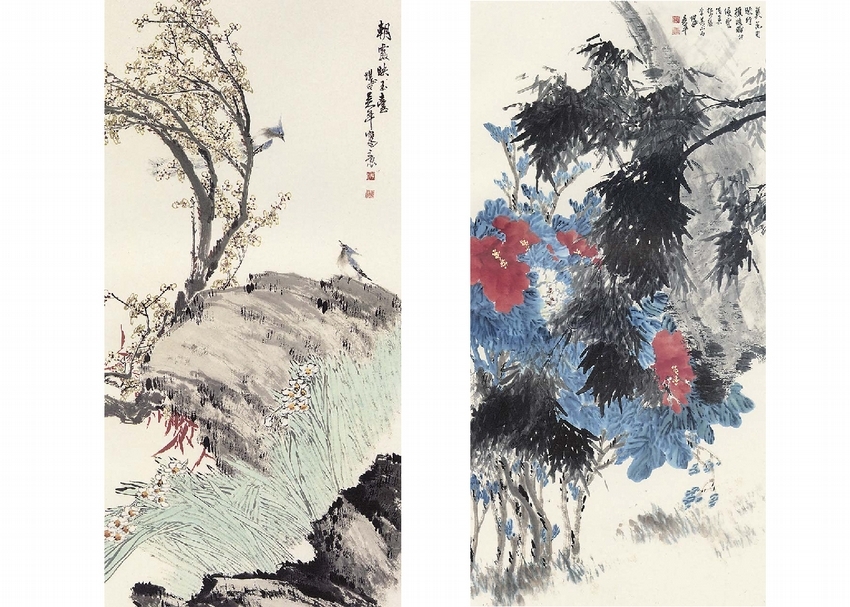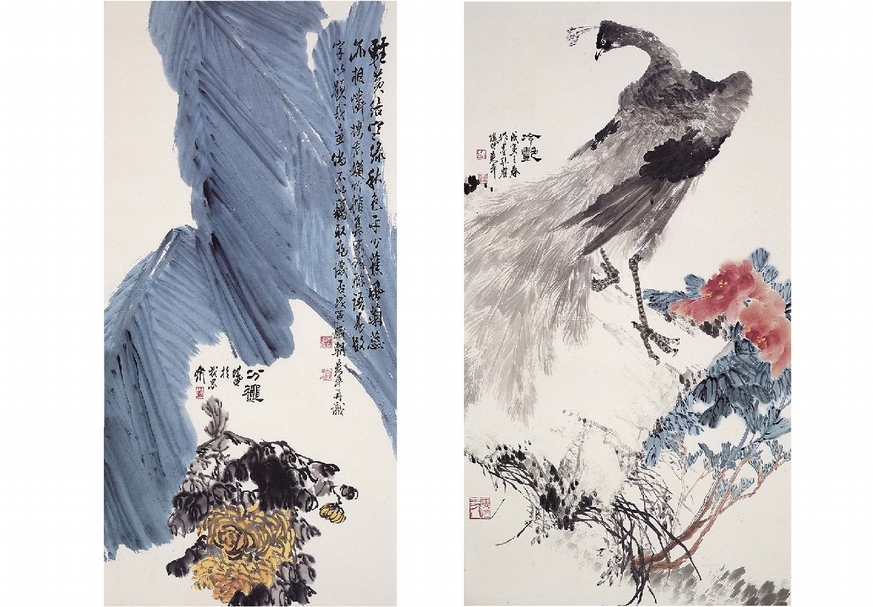 (左) 吳平〈美花映竹〉,138×69.5公分。(右)吳平1998年作〈墨孔雀〉,150×81公分。
