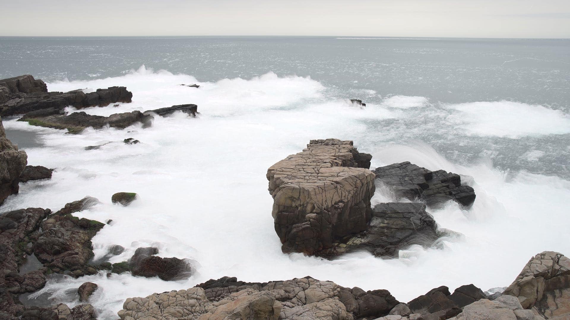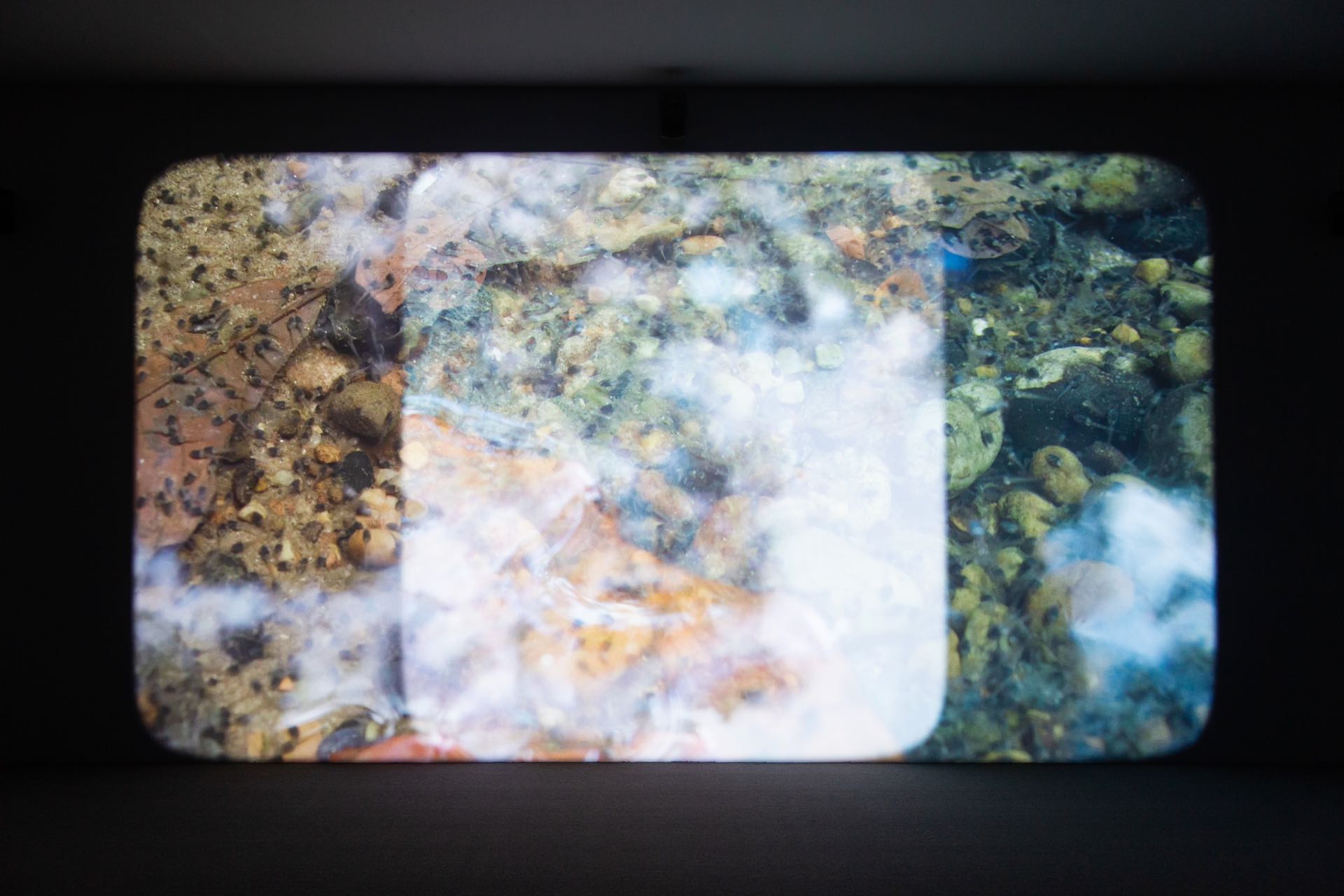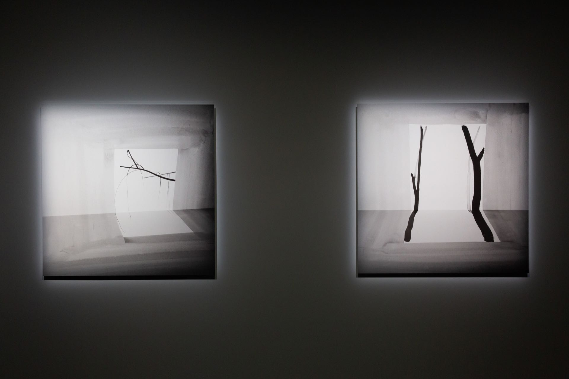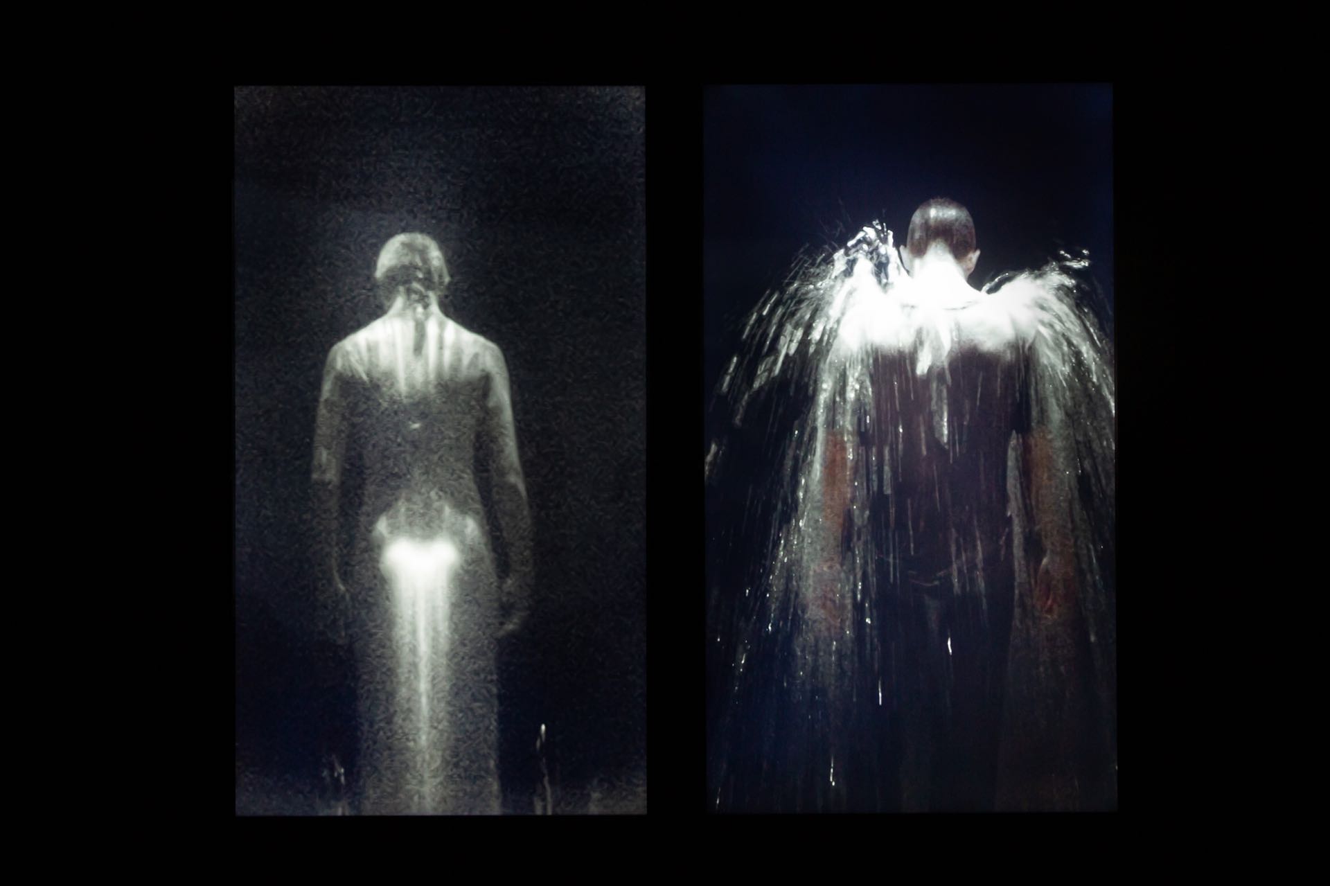 在引路人的指引與月亮的見證下,我們渡過了河流,來到了死亡的第二階段:消融。消融時間、空間、身體,與意識。吳季璁《寫生習作 001-龍洞海景》(2021)藉由即時影像演算處理系統,在錄製浪起浪落的當下將影格層層疊加,創造出界於靜態與動態間、消逝與永恆間的獨特時間感。王雅慧在《問影》(2017)裡先以水墨構築線條,再將作品對折、拍照攝影,製作出似真又假的光影及空間感。從二維、三維,再回到二維,藝術家運用多重技法,挑戰我們既有感官所認知的空間結構。採用水元素的比爾‧維歐拉(Bill Viola)的《無辜者》(2007)與李雅諾的《水》(2007),在這次的展覽脈絡裡或許可以視為身體的銷解:水不僅象徵連結不同維度之間的界面,在神秘學中也常有洗滌、純化、潔淨之意。