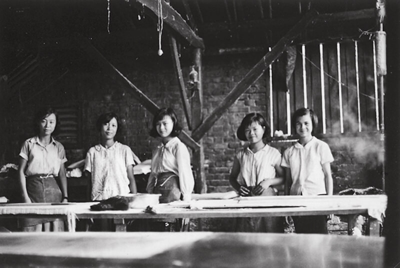 早期手工紙業製程。a、b撈紙、c、d烘紙、e樹皮原料、f包裝。