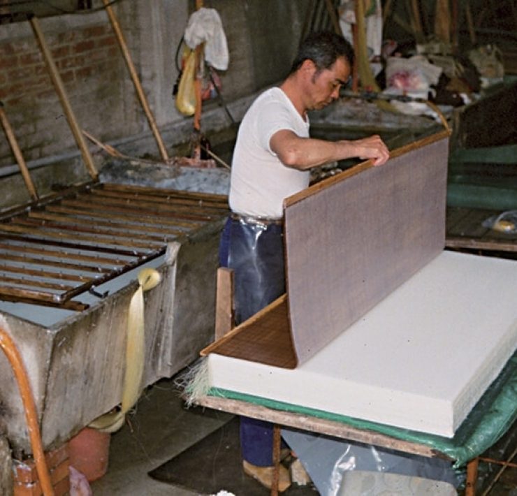「處理菠蘿宣的原料和其他原料不一樣,撈紙工序比較繁複,需比較用心和花時間去做。紙張厚薄和顏色比較均勻一點,一般都不添加化學品。所有手工紙考慮到保存性都不能添加化學品,化學品若殘留在紙張裡面會破壞纖維。若製紙時添加化學品是因為在紙張特性上有特殊要求,像是改變吸墨性,甚至有時基於畫家的要求,會特別加礬或膠劑等。我們也有其他品種的菠蘿宣有添加化學品,但會考慮到化學品必須是中性和鹼性。酸性的東西一定會破壞紙。純天然的好處是不會破壞到紙的纖維,像燙頭髮時的溫度和藥劑都會影響到髮質,纖維也是一樣。但像紙張的吸墨性或有些效果無法用純天然的方法達到,還是要靠藥品,這要看藥品的等級,食品級或工業級的價格差很多,不同等級的化學藥品品質有差。一般生宣我們並不添加任何藥品,處理原料時也用弱鹼的東西去處理,然後時間把它拉長,這樣就不會破壞到纖維。」