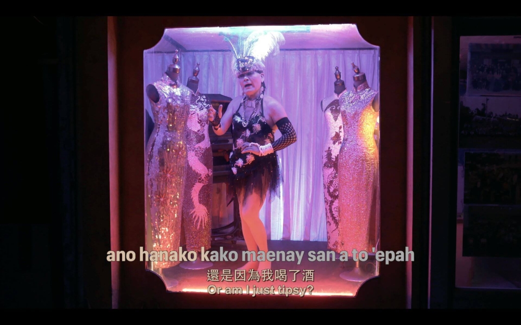 曾于軒(Posak Jodian),《Misafafahiyan 蛻變》錄像截圖,皓皓於光復鄉馬太鞍部落所開設的第一家照相館「大華照相館」表演「午夜的霓虹燈」場景。(曾于軒提供)