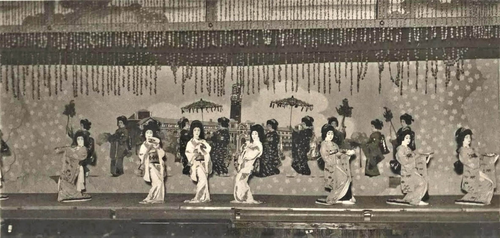 1872年始於京都博覽會的「都踊」藝妓表演,是以京都名勝交融四季景色傳達京美學魅力為特色。相較下,1935年台灣總督府舉辦的始政40周年博覽會,委請藝妓、藝妲與當時盛極一時的女給團體表演舞蹈、演劇等,則以多樣的表演形式,展現殖民統治下台灣本地的風土民情與時代潮流帶來的影響。
