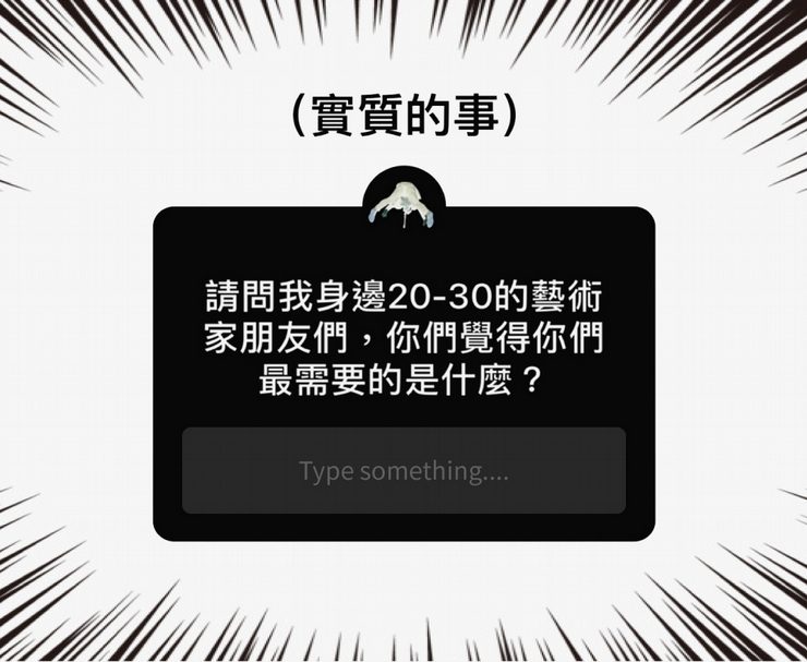 假若藝術家回應社會現實的方式,在當今已被動地成為一種「引導」(註2),或是需要透過以創作名義、追逐各種「認證」所建立的社會身分,使自己活得更美好,那麼更該質問的是在當代做藝術、各種藝術形式的實踐和產業的價值與意義是什麼?「人」希望有不同的「方法」來達到自己的「目的」,也因這個討論會是在討論「方法」,卻不是要針對每個人要達到自身目的的討論。每個人的方式都不盡相同,討論會的存在讓大家可以在這樣的場域中相遇。所以,我們或許該想的是,如何讓這樣的討論場域繼續存在,而又該以什麼方式存在?