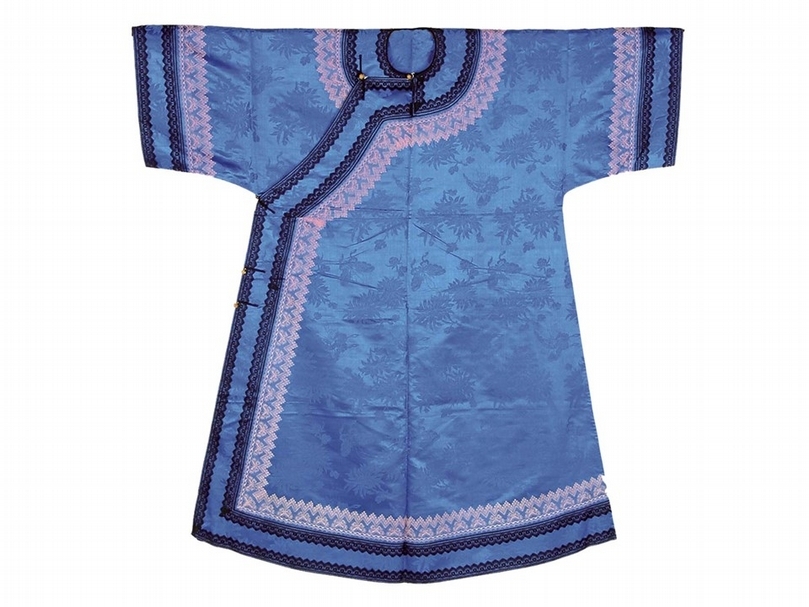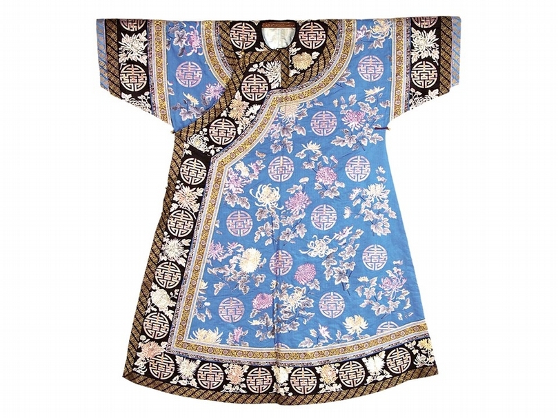 〈藍綢彩繡菊花團壽紋鑲邊棉袍〉:全長133.8公分,腰寬74公分,下擺寬101.2公分,袖口寬25.1公分,袖長58.5公分。此袍為清代后妃便服,通常套穿於氅衣或坎肩之內,亦可單獨穿著。款式為圓領,大襟右衽,直身,平袖,袖長及肘,裾不開。這件襯衣以藍綢為面,彩繡黃、粉兩色菊花紋及平金團壽字。月白色素綢為裡,面、裡之間絮絲棉。袖口為藍緞地平金團壽紋邊。領和襟綴銅鎏金鏨花扣五枚。領、袖和大襟均各鑲四道邊作裝飾,分別是:元青長圓壽字織金緞邊、元青緞平金銀團壽字菊花邊、黑地花卉紋絛邊、黃地梅花紋絛邊。這種多道鑲邊的做法是晚清后妃便服的一種裝飾特點。菊花寓意長壽,用菊花裝飾便服成為宮廷的一種時尚。