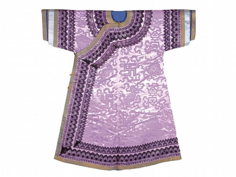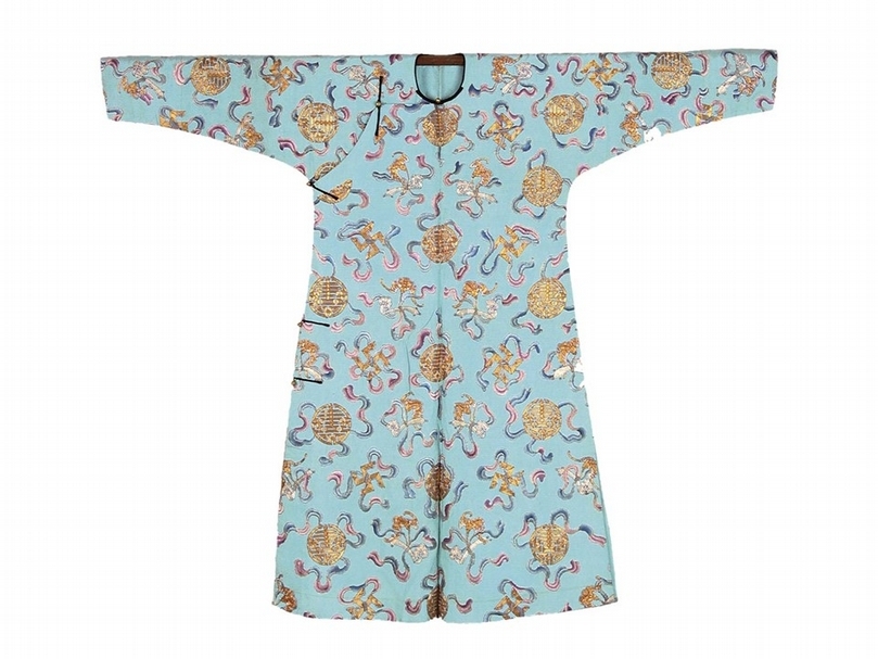 〈湖色羅繡平金萬福壽如意女單袍〉:身長111公分,袖長67公分,腰寬50公分,下擺寬74公分。袍為圓領,大襟右衽,平袖,直身式袍。湖色羅面,滿繡平金卍字及團壽紋,彩繡如意紋,間飾飄帶。湖色素羅裡,綴銅鎏金鏤空圓扣五枚。