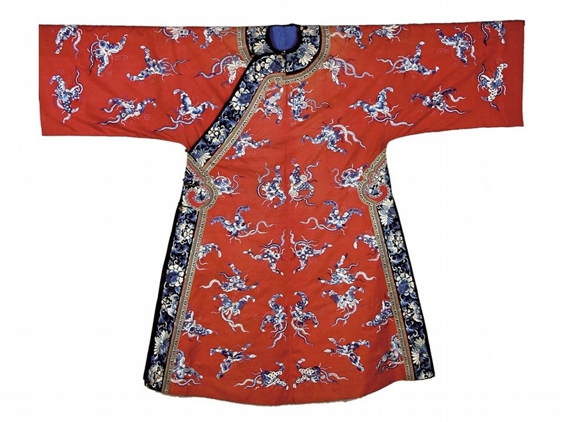 〈大紅寧綢百蝶女夾氅〉:身長147公分,腰寬78公分,下擺122公分,袖長93公分,袖口45公分。氅衣,是清代內廷后妃穿在襯衣外面的一種日常服飾,也是后妃服飾中花紋最為華麗,做工最為繁縟,穿用最為頻繁的服飾之一。此件氅衣為典型清中晚期后妃常服樣式,圓領,平袖,大襟右衽,左、右腋下為如意雲頭紋樣並開襟連至下擺;領襟及左、右開襟採用石青地,上繡藍白色菊花、牡丹、葵花及蝙蝠圖案,領襟、開襟之外,鑲以淺黃綠色花牙,將藍白黑相配的紋樣烘托得更為雅觀;氅衣面料採用大紅寧綢,火熱吉祥,表面以淡雅的白藍兩色,彩繡出形態各異的大小花卉與葉片,並由其組成一只只精美獨立的蝴蝶,從設計到製作都形象逼真,令人拍案叫絕,可以說是以新的思維,將傳統題材做了一次大膽的創意;衣裡用藍色綢裡,使整個服裝變得穩重,為服飾增色。