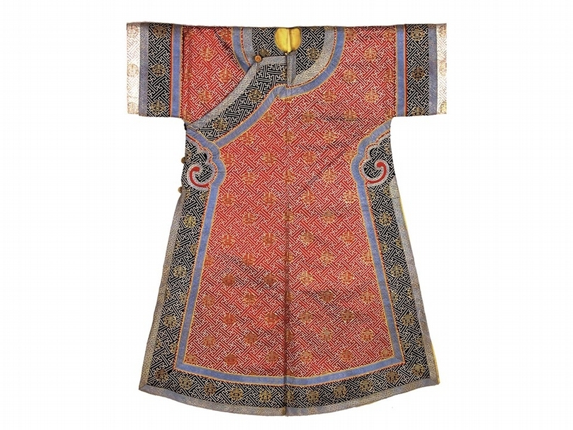 〈紅緞平銀卍字地金團壽氅衣〉:身長145公分,袖長60公分,腰寬76公分,下擺寬117公分。為后妃所穿便服,圓領,大襟右衽,平闊袖雙層,袖長及肘,直身式袍。紅色緞面,滿繡平銀卍字及平金團壽字。內袖為白色地平金卍壽字緞邊。領、外袖、襟邊鑲飾繁複,邊飾從裡到外分飾有寶藍色萬字曲水織金緞邊、黑地藍色織金斜卍字絛邊。黃綢素裡。綴銅鎏金扁圓扣四枚、銅鎏金圓扣一枚。