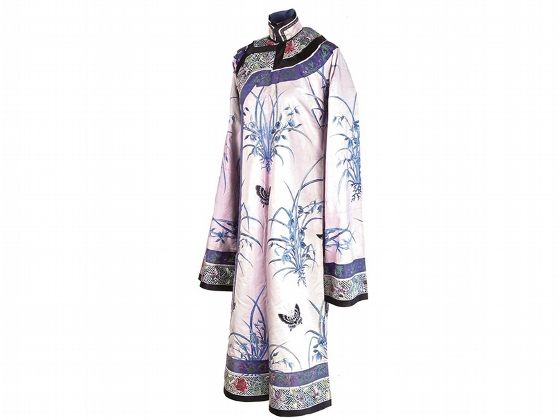〈藕荷緞藍蝶鑲邊女夾襖〉:身長140公分,腰寬54公分,下擺寬82公分,袖長110公分,袖口寬30公分。此衣為圓立領,大襟右衽,平袖,直身式袍。衣以藕荷色緞為面,彩繡蘭花、蝴蝶紋。領、襟、袖鑲有三道邊,分別為黑色素緞邊、黑色卍字地繡菊蝶緞邊、藍色竹梅緞邊。綴黑色盤扣七枚。藍色細布裡。此件襯衣展開後顯得比其他襯衣要瘦長,這是進入清末以後,在西洋服飾風格的影響下,傳統的服飾發生了變化,以展示女性身材為主,因此,袖子變窄、腰部束身,版型與現代旗袍更為接近一些。