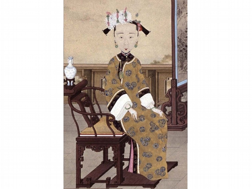 清道光〈喜溢秋庭圖〉(局部)描繪身著便服的道光皇帝與后妃、子女在庭園中賞花嬉戲的情景。本圖所示之全皇貴妃身著清代袍服,袍身寬大,袖子寬肥,袖口為平直造型,並著月白色挽袖。圖/故宮博物院。