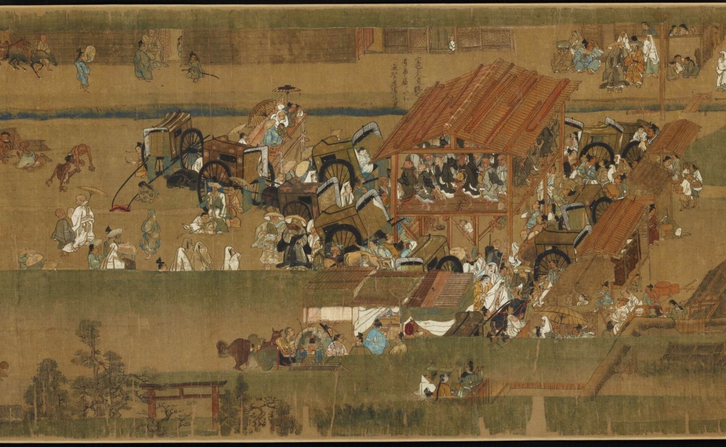 其中第七卷,描摹了僧侶們在市集中搭建舞台,一群僧人順時鐘圍著圓圈敲著鉦鼓,手舞足蹈的場景。舞台周遭圍滿了觀看的人群,舞台下方還有攀附在支架上的孩童。許多人坐車前來觀看,舞台左側甚至架了一座「觀眾席」,讓貴人們不用人擠人,有更好的角度觀看佛舞。由此可知,「踊躍念佛」的祈福方式到了13世紀已經普及且受人歡迎。