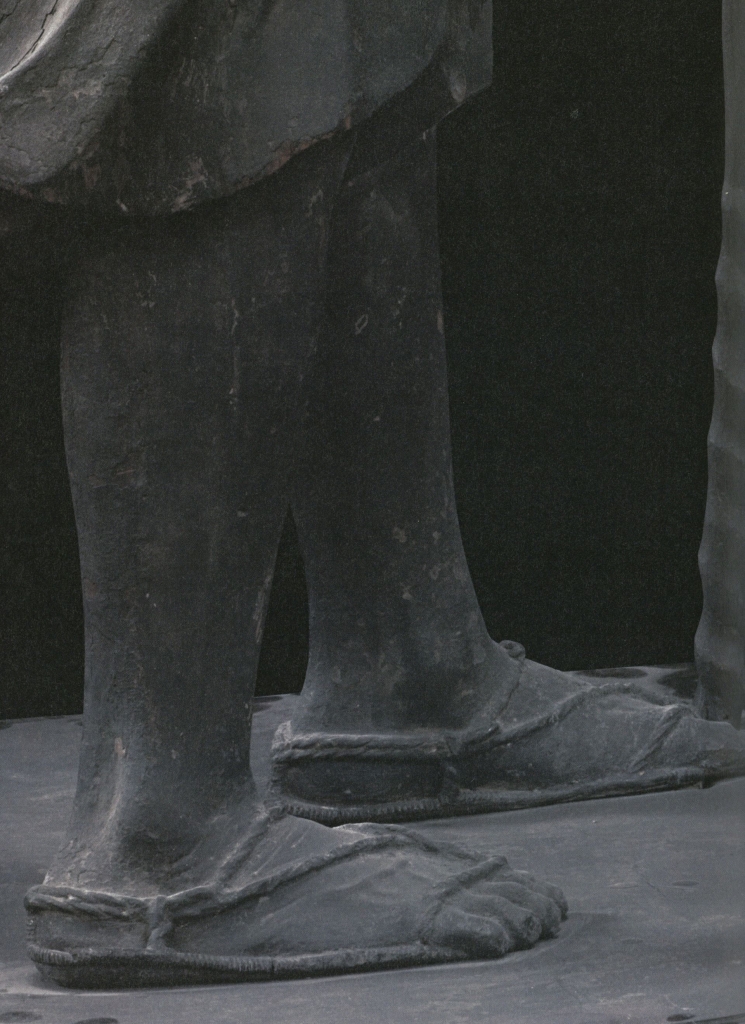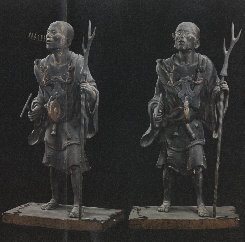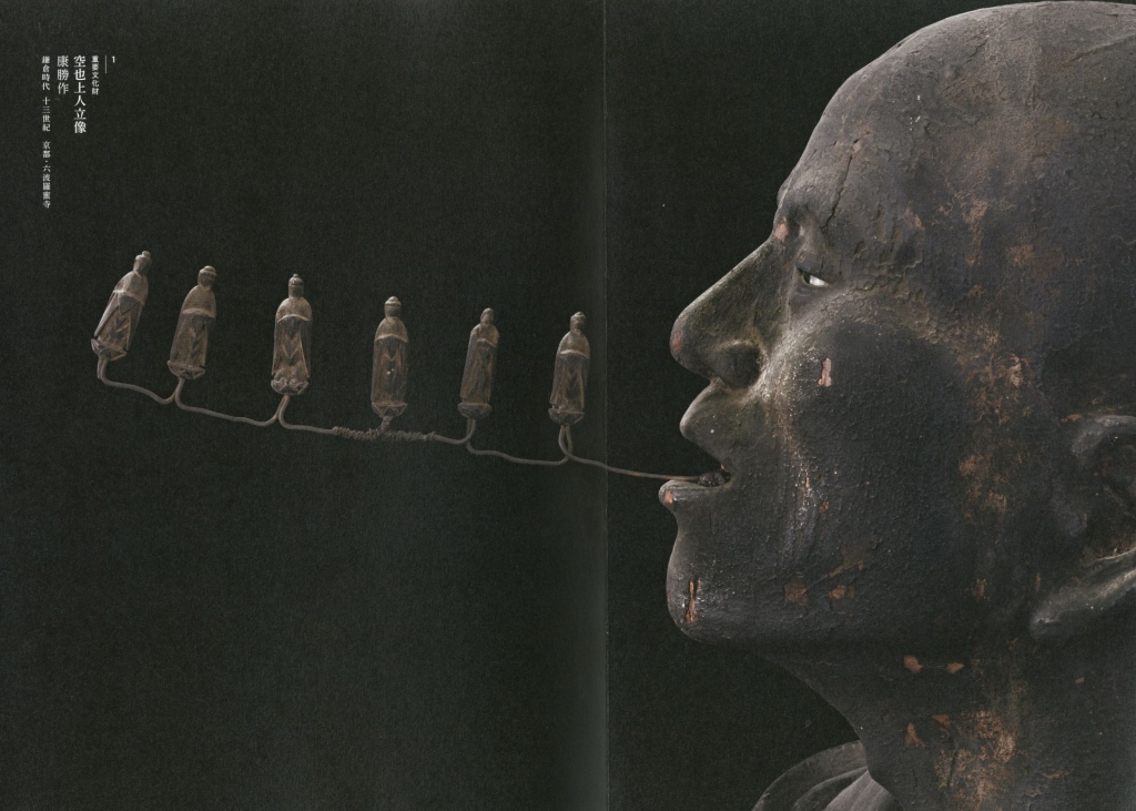 《空也上人立像》呈現了一位飽經風霜的僧侶脖子掛著鉦鼓,右手拿著木槌作勢敲擊,左手撐著鹿杖,身體微微前傾,表現出行走動態。相傳空也與鹿關係友好,一隻空也視為好友的鹿被獵人射殺,悲痛之餘,空也請獵人將鹿皮與鹿角給他,將鹿角製成拐杖,腰間裹著鹿皮,終生不離身。後來獵人懺悔自己的殺生行為,請求成為空也上人的弟子,跟隨其度化眾生。而邊敲擊鉦鼓邊行走的動態,正是空也於市集中「踊躍念佛」為大眾祈福的形象。