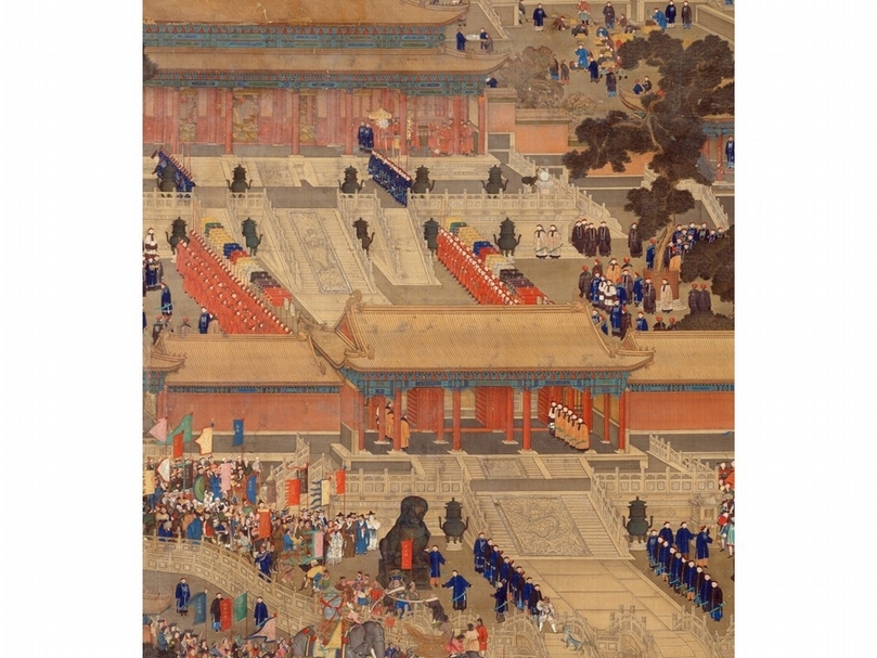 清中期形成較為嚴格的侍衛等級制度,侍衛服飾也因等級不同而形成不同的服飾形式。圖為清〈萬國來朝圖〉軸局部。(李理、李姝夢提供)