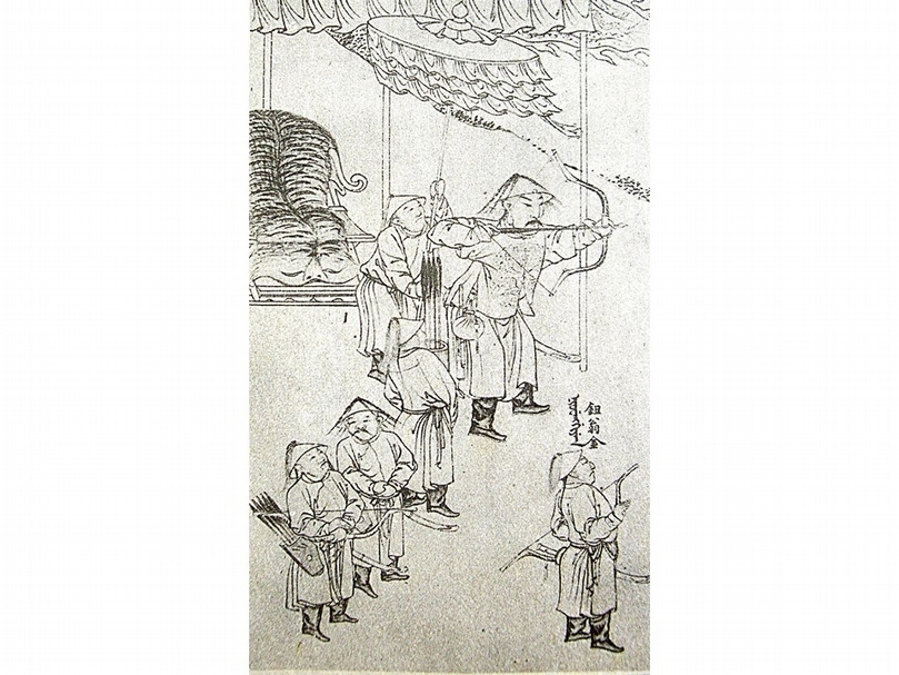 清早期皇帝(汗王)、侍衛所戴用的涼帽樣式。圖為清〈太祖實錄戰圖〉之「太祖射柳於洞野」局部。(李理、李姝夢提供)