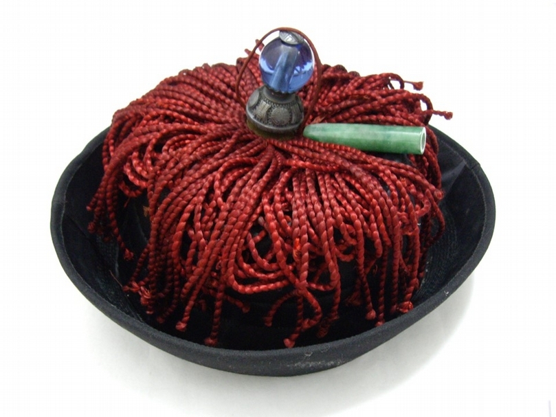 暖帽,清入關前已經定制戴用。圓式類於氈帽外形,以皮毛、絨、呢等為材質,帽外檐向上卷起,帽頂通常為緞製。初寒用呢帽,次則用絨,極寒用皮。顏色尚黑。帽檐選用皮質按等級定制,三品以上及翰、詹、科、道各官,准用本色獺、薰鼠、染貂。帽頂覆綴紅纓(紅絲穗)。官員帽頂各按品級飾有頂珠。居家守喪者,其暖帽不得用頂戴。