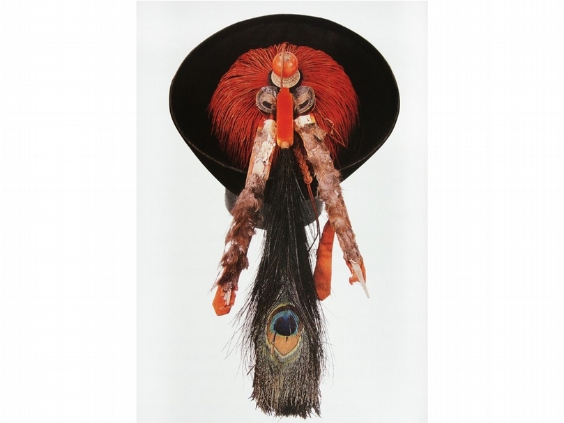 花翎是安插於清朝官制冠帽上的孔雀尾翎,是宮廷侍衛特殊身分和地位的標誌物。按照清朝典制規定,「頂戴花翎」有一眼、二眼、三眼孔雀翎和藍翎等幾類形式,翎眼越多,象徵地位越高,其中貝子、固倫額駙冠帽,皆加飾三眼孔雀翎;鎮國公、輔國公、和碩額駙冠帽,皆加飾雙眼孔雀翎;內大臣、一、二、三、四等侍衛以及前鋒、護軍統領、參領、前鋒侍衛等冠帽,皆加飾單眼(一眼)孔雀翎;藍翎侍衛等人冠帽,皆加飾無眼的藍翎。(註13)