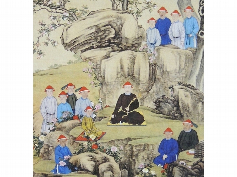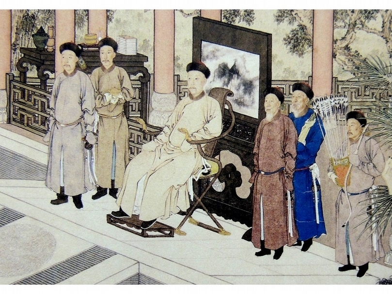 清宮侍衛隨皇帝在後苑內穿著常服袍。清〈雍正帝行樂圖〉軸局部。(李理、李姝夢提供)