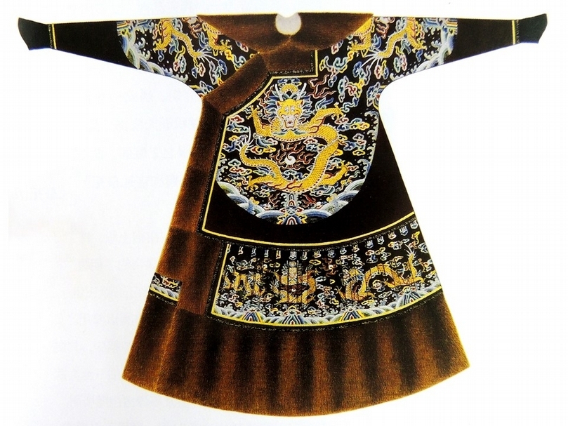 朝袍為清朝官制禮服,凡遇常朝、祭祀日、三大節(元旦、冬至、萬壽節)朝賀等活動,宮廷侍衛均要穿著朝袍參與宮中活動。其式為大襟長袍,上衣連下裳,披肩領,熨褶素接袖(滿語稱「赫特赫」),袖端為馬蹄式(亦稱「箭袖」),袍身中部為腰帷,下接襞積(打),底部為裳,衣長及腳,袖長掩手。朝袍從使用上劃分,可分為冬朝袍、夏朝袍兩類。夏季多用紗地絨繡、納紗繡及妝花或緙絲袍,春秋用緞或綢地繡花及妝花緞、緙絲之棉袍、夾袍,冬季則穿裘皮朝袍。每年三月十五日或二十五日始穿夾朝衣,九月十五日或二十五日易裘皮朝衣。文四品、武三品以下,除職掌大臣及一等侍衛,不得用貂緣朝衣。順治十五年(1659)定制,王公及百官貂緣朝衣,於每年十一月十五日始著,至翌年正月十六日止。乾隆十九年(1754)更定,十一月初一日始著,永著為例。