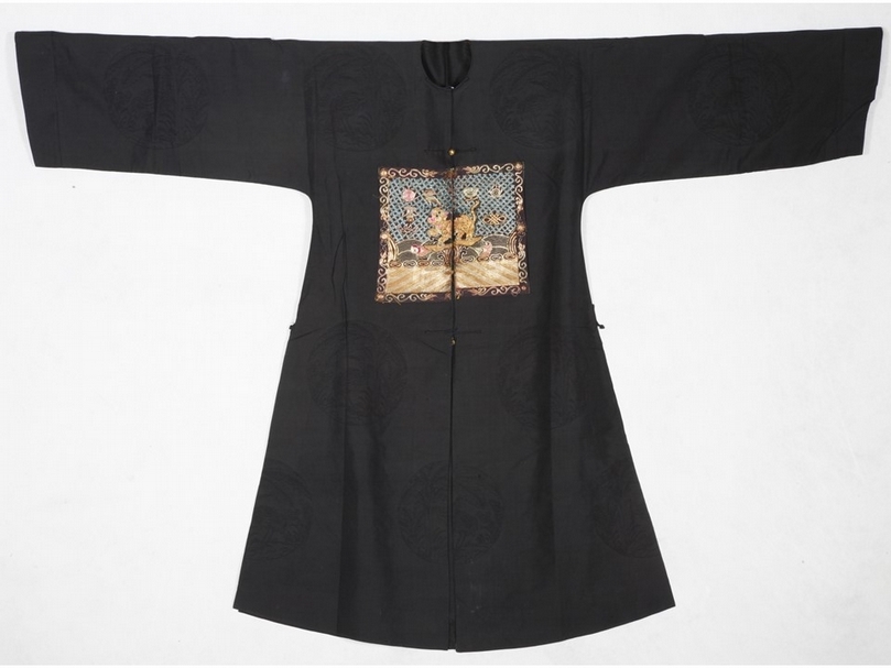 補服,是清朝王公大臣、侍衛、文武百官最重要的官制禮服和吉服,可於宮中各種重要場合穿用。為長褂對襟式,圓領,平袖,左右及後面開裾。常以石青緞、石青紗料製作。補服要在衣服前胸及後背,各縫有一塊繡好圖案的「補子」。其中,前胸上的補子為前補,中間有開縫,以便對襟穿著;後背上的補子為後補,為完整的補子。