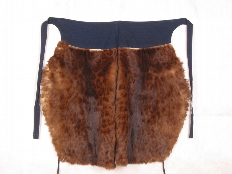 侍衛行裳又稱為「都什希」,滿洲人起源於東北地區白山黑水,冬季寒冷漫長,人們騎於馬上多要穿著皮衣皮褲,故宮廷中保持有行裳之俗,以獸皮、獸毛或棉、夾織物製成下裳,以避嚴寒。按清宮定制,行裳造型為左右各一幅,中間為直幅,左右兩側均呈圓弧形,上部連接橫帶,繫於腰間;或製成毛皮、氈、夾等形式,顏色各異,冬季多用皮毛製品,以起到更好的保暖護身作用。(註9)