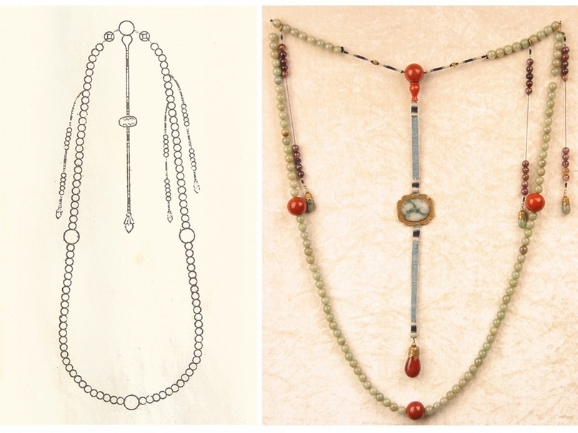 清宮侍衛朝珠圖,出自清《皇朝禮器圖式》(右)及清宮侍衛所佩朝珠。(李理、李姝夢提供)