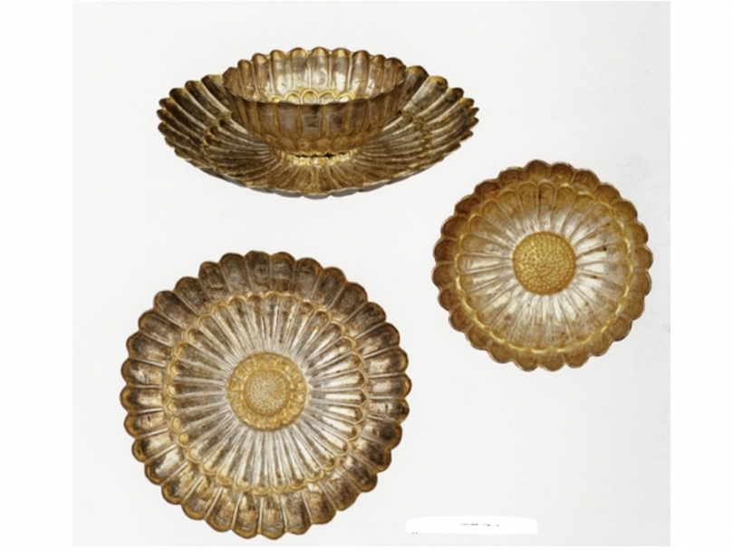 江蘇溧陽縣平橋鄉宋代窖藏出土的鎏金銀盞,分別為宋代《鎏金單瓣蓮花銀盞》(左)、宋代《鎏金六曲葵花紋銀盞》(中)及宋代《鎏金十二曲六角梔子花形銀盞》(右),鎮江博物館藏。(翻攝自鎮江博物館編《鎮江出土金銀器》,北京:文物出版社,2012)