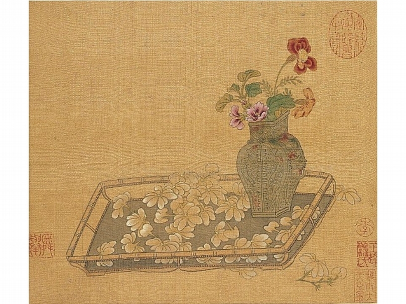 宋錢選《畫花籃圖冊‧瓶花》,國立故宮博物院藏。畫中的方形盤面上,散落的黃花即為萬壽菊。(©國立故宮博物院opendata專區)