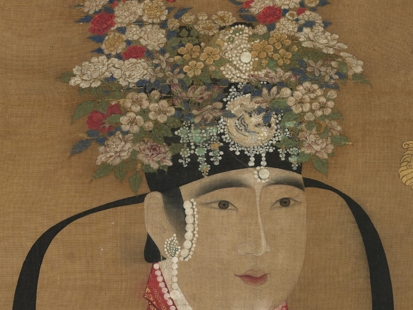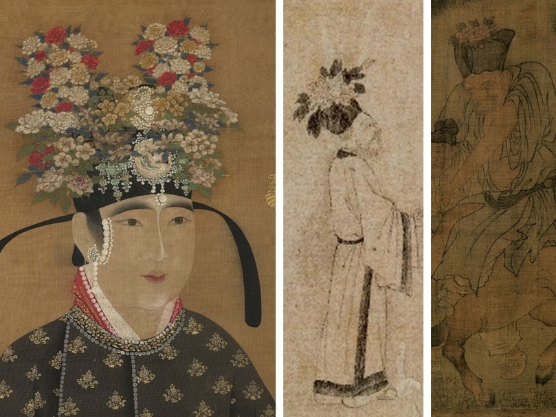 宋人愛簪花,現存繪畫有多例可證。如北宋《宋仁宗后坐像》的女官(左)、宋代《商山四皓會昌九老圖》的老者(中)及宋代《田畯醉歸圖》的男子,皆在頭上裝飾鮮花。(《宋仁宗后坐像》為國立故宮博物院opendata專區提供,後二者翻攝自浙江大學中國古代書畫硏究中心編《宋畫全集》 ,杭州:浙江大學出版,2008-。)
