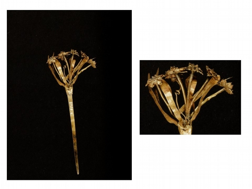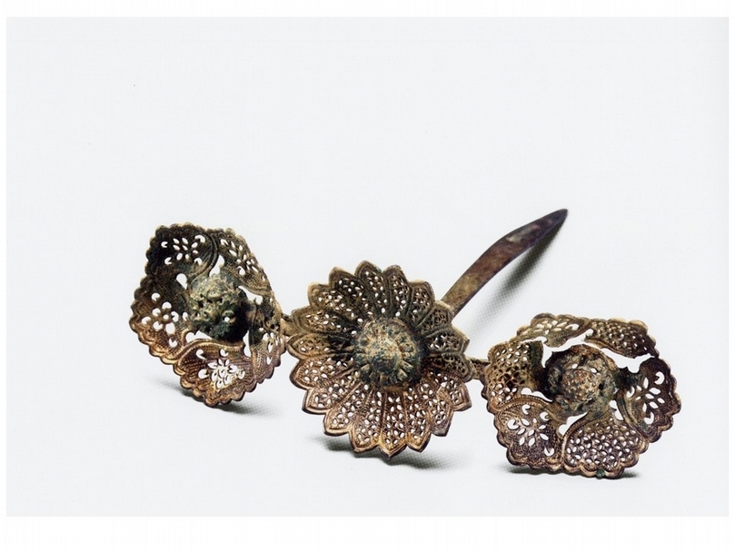 宋 《三花頭鎏金銀橋梁簪》,縱11.5公分,橫11.2公分,浙江長興縣泗安鎮初康村桂花自然村出土,長興縣博物館藏。(翻攝自浙江省博物館編《錯彩鏤金——浙江出土金銀器》,浙江:浙江人民美術出版社,2016)