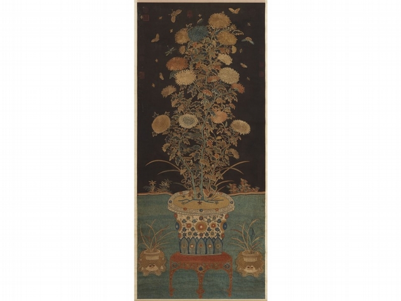 宋繡《菊花簾》,國立故宮博物院藏。本幅作品針線精巧縝密,用色鮮豔奪目,盆景內的三枝菊幹上,盛開與待放菊花大小共計26朵。(©國立故宮博物院opendata專區)