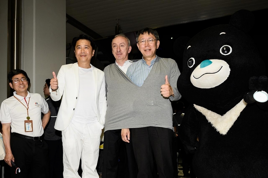 臺北市市長柯文哲、法國在臺協會主任公孫孟、2019臺北白晝之夜藝術總監胡朝聖體驗奧地利藝術家歐文.沃姆裝置作品《一分鐘雕塑》(2019臺北白晝之夜提供,攝影/林軒朗)