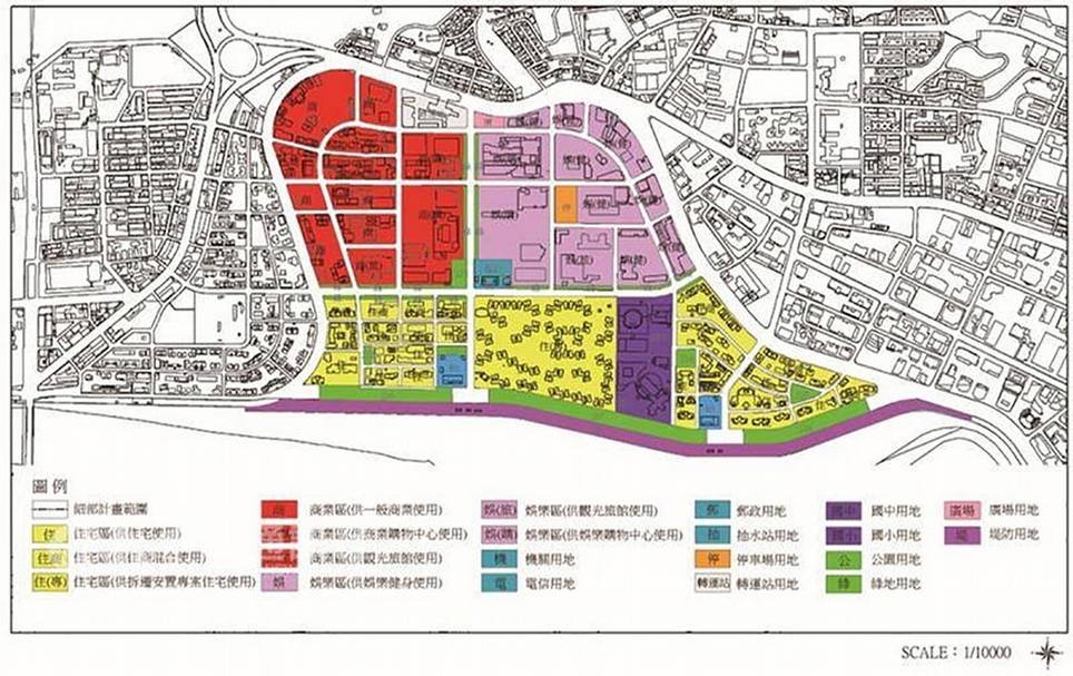 大直重劃區(大彎北段商業宅)的都市計畫分區圖,圖中的紅色和紫色區域皆為商業區,而如今紅色區域大量違規蓋成豪宅的商業宅,已在今年被就市政就地合法。