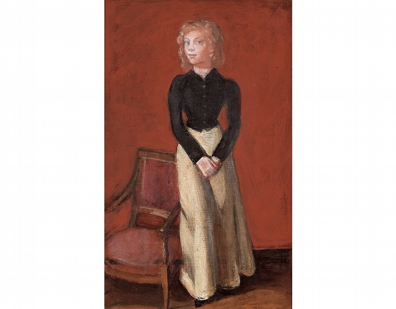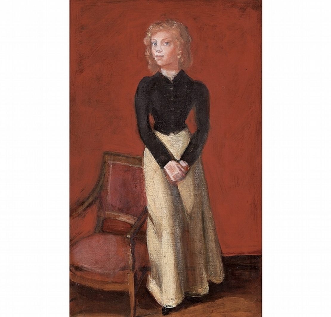 巴爾杜斯《穿騎士女裝的年輕女子肖像》.油彩畫布.51×30.5 cm.1932(1981年重畫)。