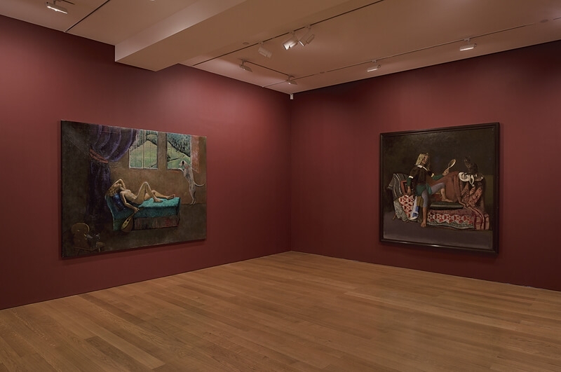 展覽牆壁漆上暗紅色,映襯著巴爾杜斯的繪畫,尤其人物景象,顯現了一股懸宕、詭譎的非現實氣氛。創作手法上,他雖依照理性思維對待所認知之事物,由一般人習見的外表入手,讓人一眼就能明瞭繪畫對象,但這忠實於原貌的寫照卻在經他繪寫的同時,形成了意義上的轉變,令人感受到另一種不易觸及如永恆般的特質。51件展覽作品時間跨度逾一甲子,除了略見按時序、主題、媒材的陳列方式,囊括室內肖像畫、街景草圖、風景畫與攝影作品,配合著入口處展牆貼印的藝術家自白:「我總在平凡事物中感到尋找不平凡的慾望。在我的畫中留下一絲神秘感。」強化了同他人生故事像謎一般的神秘奇妙。