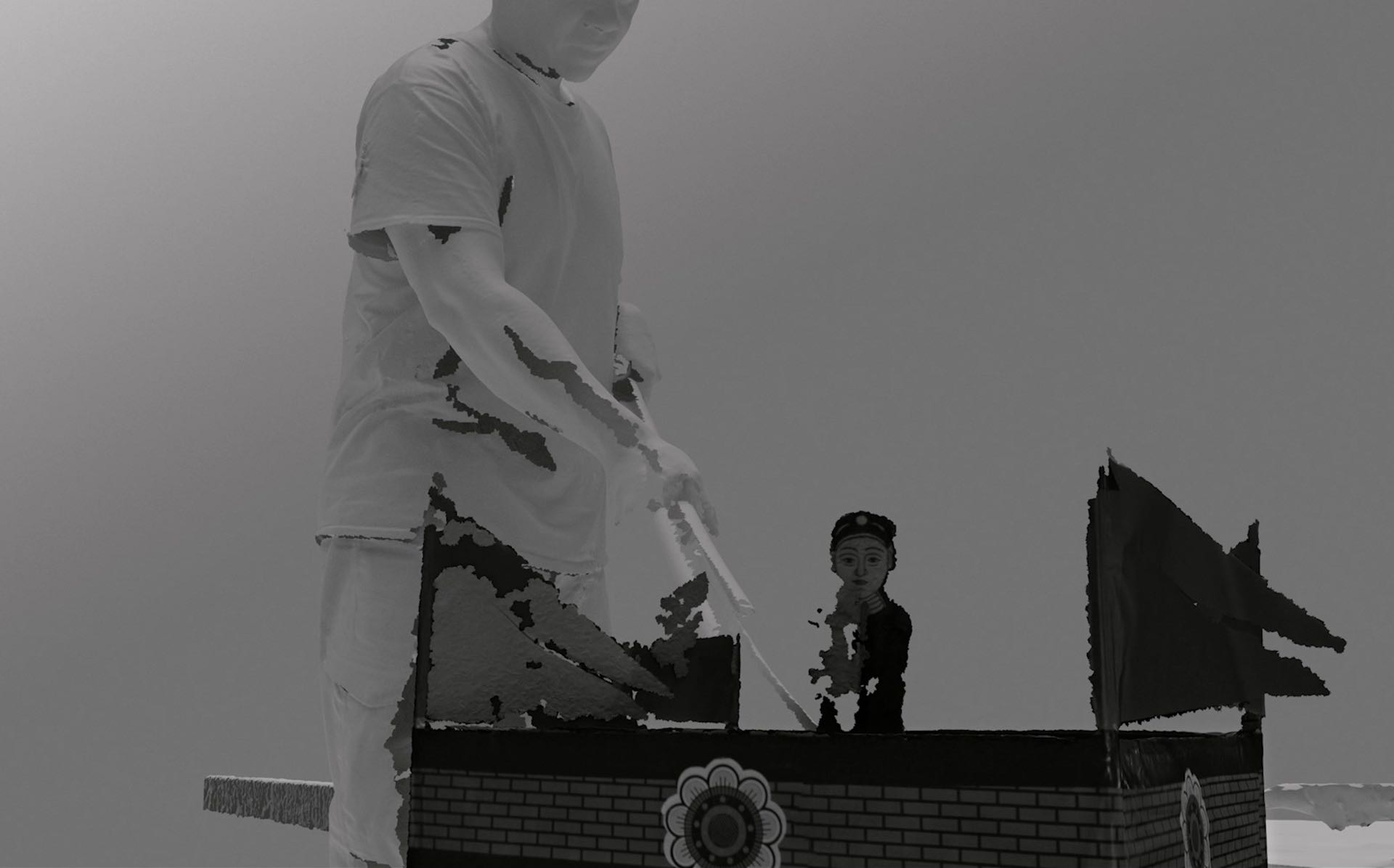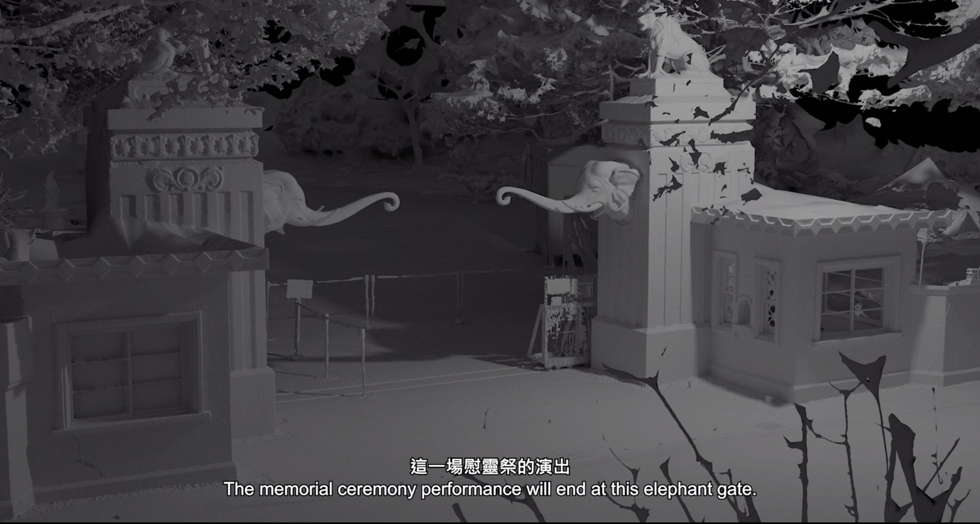 「三次哀悼練習」影像由3D掃描的白色基底模型構成,大量留有掃描過程中的破損和窟窿,影像外的展場則顯得平滑空曠,看似是一場將無數皺褶包藏的簡單喪禮,而我們唯有透過許哲瑜的影像進入到皺摺中,才能找到觸發歷史與生命記憶的瑪德蓮。(註1)