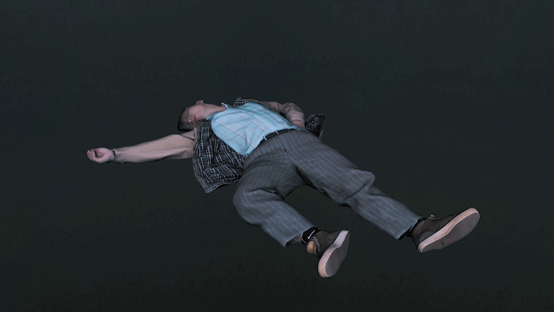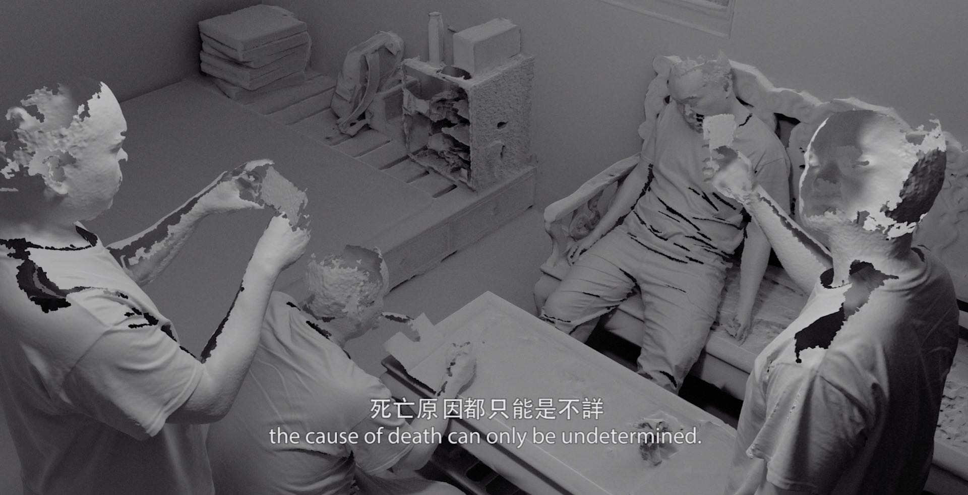 「三次哀悼練習」帶來的新影像語言,也許我們可以從兩個切面更清晰看到藝術家對於死亡意象的影像的嘗試。首先,相較於以往,此次透過數位掃描建立的模型更顯得粗糙、破碎。這原因當然有來自於幾個技術本身的漏洞,像是掃描的點不夠密集,或是掃瞄現場有反光物件等,都會導致最終無法成像。不過,許哲瑜和陳琬尹卻選擇不再修補這樣的模型,保留技術本身的瑕疵,除顯現現階段的技術能力外,數位掃描團隊的多數任務是重建刑事案件中的「死亡現場」,因此保留掃描現場的影像也因此別具意義。