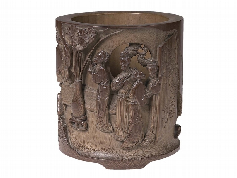 盛放毛筆之用的筆筒,是文人書案上的常設之物,也是吾人最常見也最習以為常的文房用具。明代文人朱彝尊(1629-1709)曾作《筆筒銘》:「筆之在案,或側或頗,猶人之無儀,筒以束之,如客得家,閑彼放心,歸於無邪。」極為傳神而具象地寫出了筆筒在文房用具中的重要性。由於一般呈圓筒狀的筆筒體積較大,筒身周圍復可雕可畫,甚具藝術裝飾與表現力之特質,因此甚受文人與藝匠的青睞。對於筆筒,晚明文人較偏好竹、硬木材質。如屠隆《考槃餘事》:「湘竹為之,以紫檀烏木棱口鑲座為雅,餘不入品。」《長物志》:「筆筒,湘竹,棕櫚者佳。毛竹以古銅鑲者為雅,紫檀、烏木、花梨亦間可用。」尤其晚明嘉定的竹雕筆筒,善用高浮雕、淺浮雕以及透雕等技法,竹刻之器儼如名畫,取得了極高的藝術成就,更是備受文人雅士的喜愛,國立故宮博物院所藏明末清初〈朱三松款竹雕仕女筆筒〉,即為嘉定竹人朱三松的代表性作品。