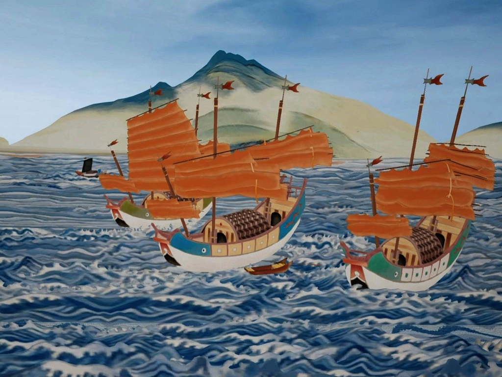 VR劇本中對「三態」作品的鋪陳,首先以《赤崁樓暮色》與《淡江泊舟》表現動畫開場,夕陽西下過渡到黑夜月升的赤崁樓,在淡水河上漂泊的戎克船,說明郭雪湖即使身在異地──美國,仍不間斷地藉由重複描繪臺灣風景,回憶故鄉的景色。在「望鄉三態」的虛擬世界中,不論是《赤崁樓暮色》中的白色帳篷攤販,或是《淡江泊舟》的戎克帆船,皆是畫家記憶中故鄉的象徵,也反覆出現在郭雪湖的其他作品,成為他思鄉之情的具象化表現。