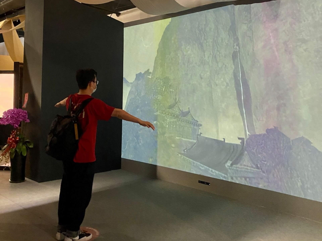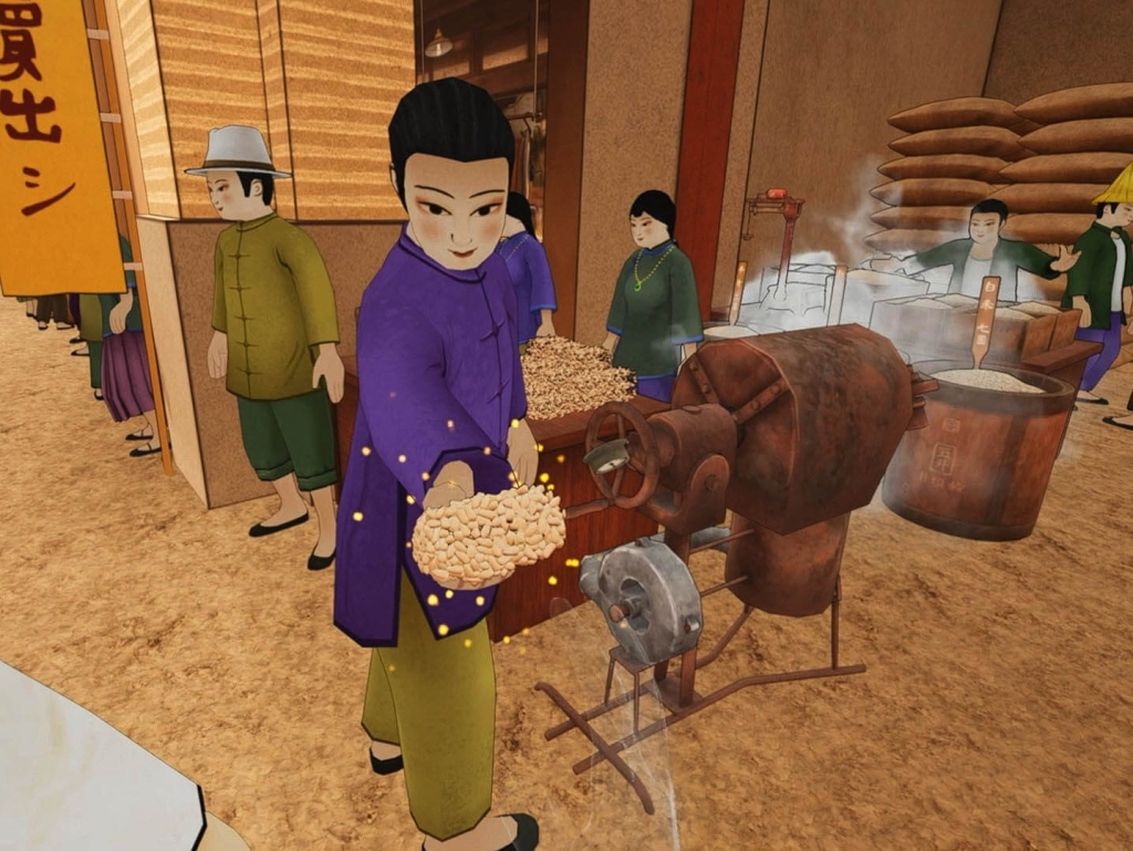 除此之外,「望鄉三態」製作團隊在基於「故鄉」與「地方」展覽脈絡的前提下,還加入原畫之外的衍伸想像,即是對文物畫面的再詮釋。諸如《南街殷賑》場景中新設的茶鋪、米舖店面,亦或是鹹光餅、玉蘭花等物品的互動橋段。製作團隊嘗試將畫家自述的感官經驗:「從淡水港到臺北市區的交通,由水路轉變為鐵道之後,南街一帶便逐日繁昌起來,每逢節慶更是人山人海,歡騰熱鬧至極。」(註2)藉由虛擬景觀與互動模式,將當代大眾對於傳統老街的固有印象相結合,以此達到沉浸共感的氛圍。