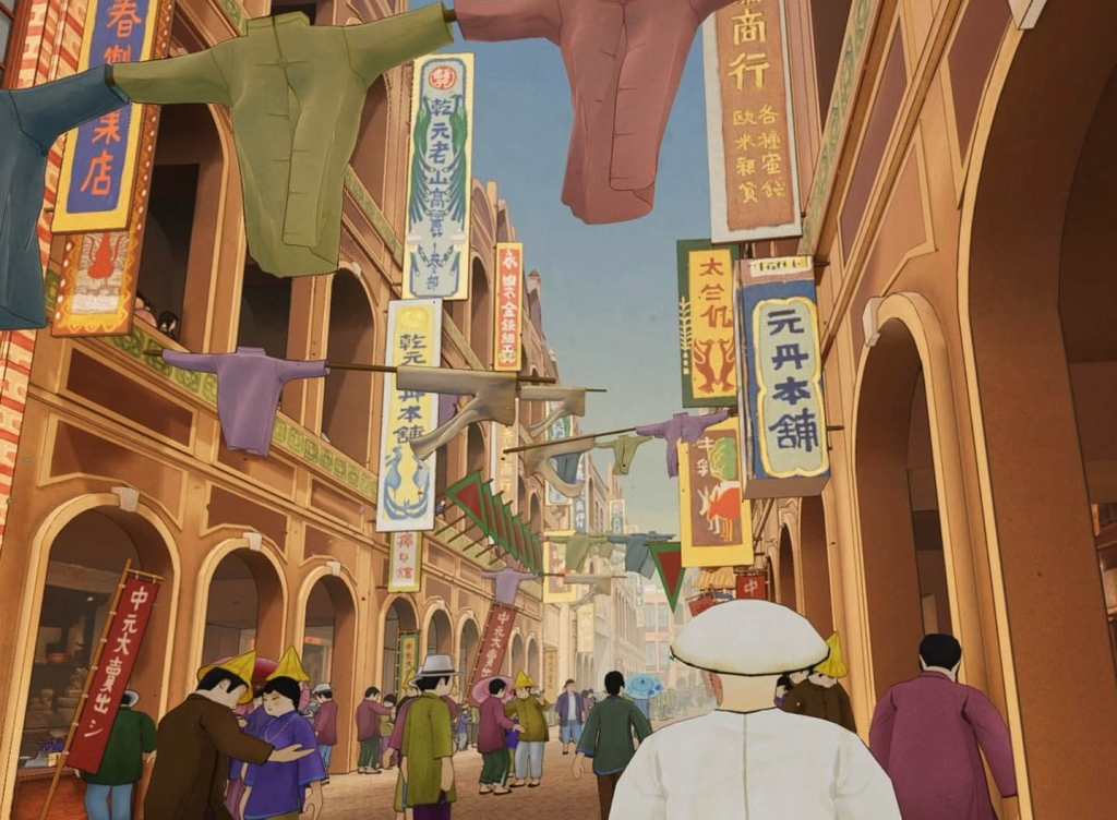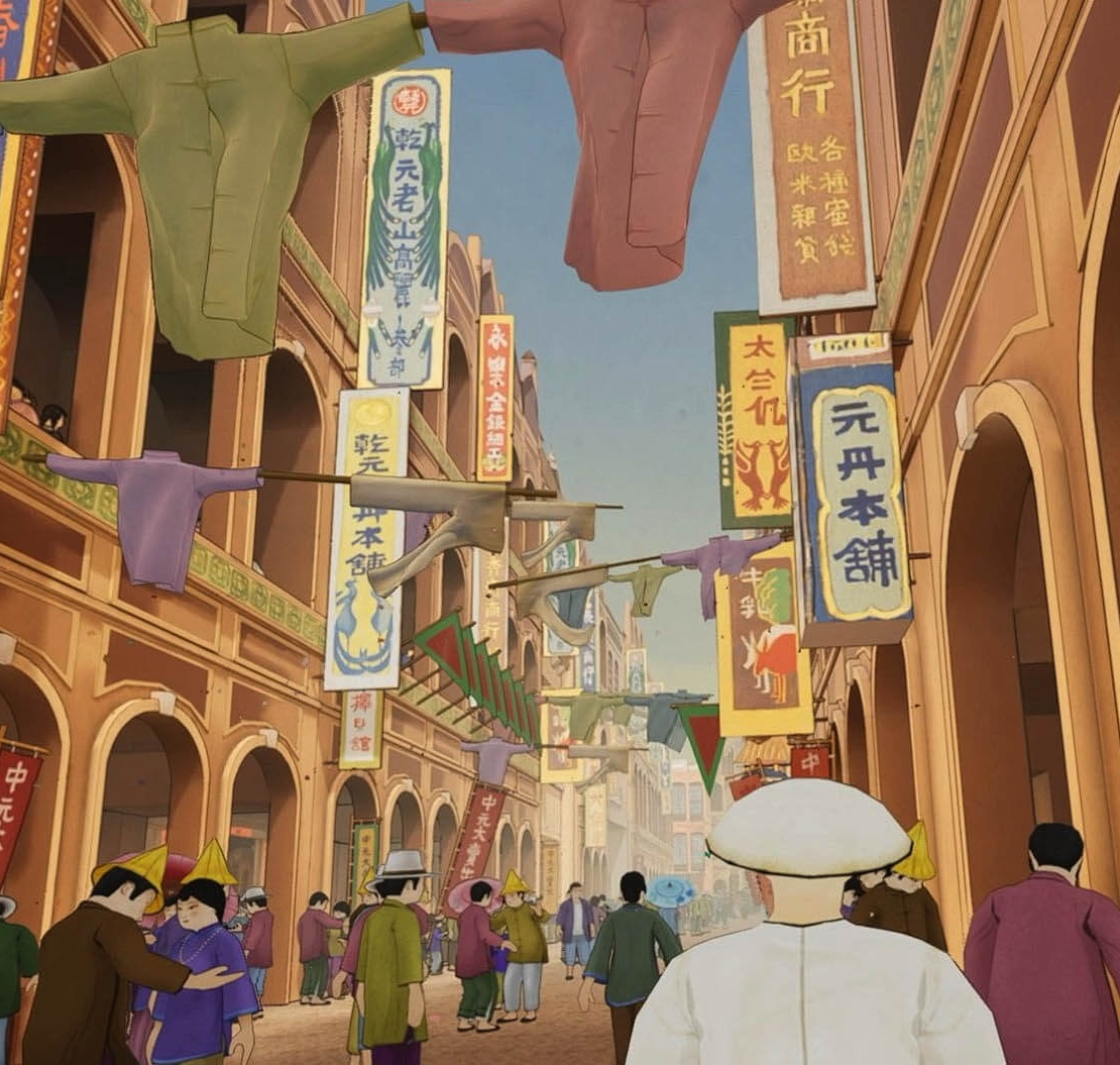 隨後進入本作的高潮橋段──《南街殷賑》。《南街殷賑》是郭雪湖入選第四回臺灣美術展覽會的作品,描繪臺北大稻埕城隍廟周邊的街景。在VR場景中,觀眾可直接走入大稻埕的街衢,搭乘人力車穿梭於熱鬧巷弄,與街邊攤販互動。最終,這趟回憶之旅結束於郭雪湖大稻埕的舊家與美國畫室的古今呼應中。