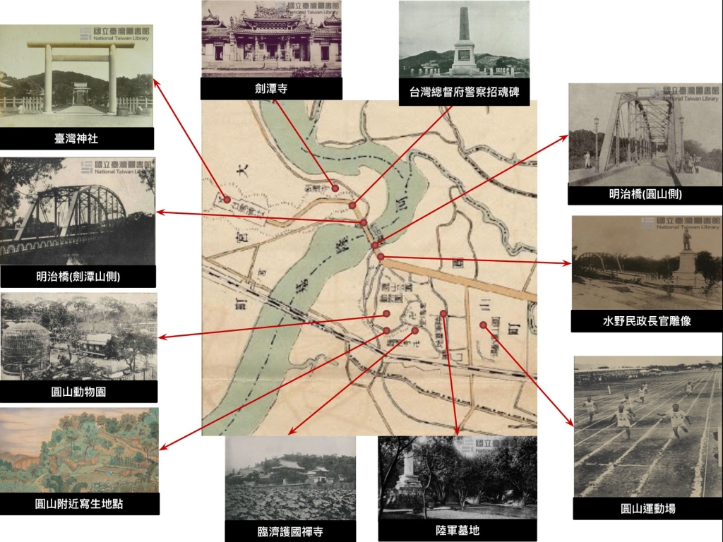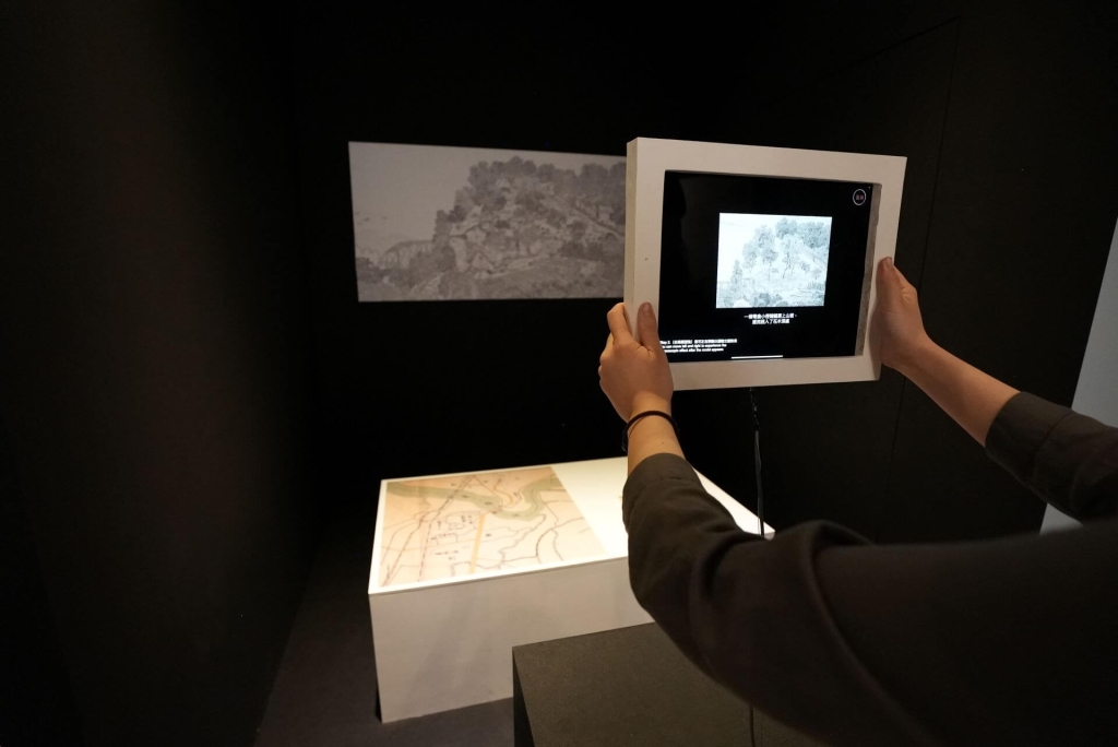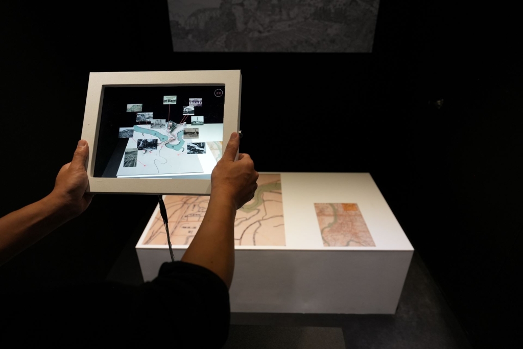 有關《圓山附近》的取景地點,學界眾說紛紜,至今尚未有統一的說法。(註5)上述兩件作品的創作者對《圓山附近》的取景點位有不同的詮釋。在范欽慧的作品中,聲音雖未給出答覆,但是透過與觀眾一同橫跨基隆河,爬上劍潭山的步行足跡,凝聚出藝術家的解答──《圓山附近》描繪的場景是「劍潭山」。而故宮AR 展件的「歷史再現」單元,則可見地圖上的《圓山附近》被安排於圓山動物園與臨濟護國禪寺兩點位之間,正對著圓山山腰。不同於范欽慧的觀點,故宮團隊認為郭雪湖的取景視角應為「圓山」。