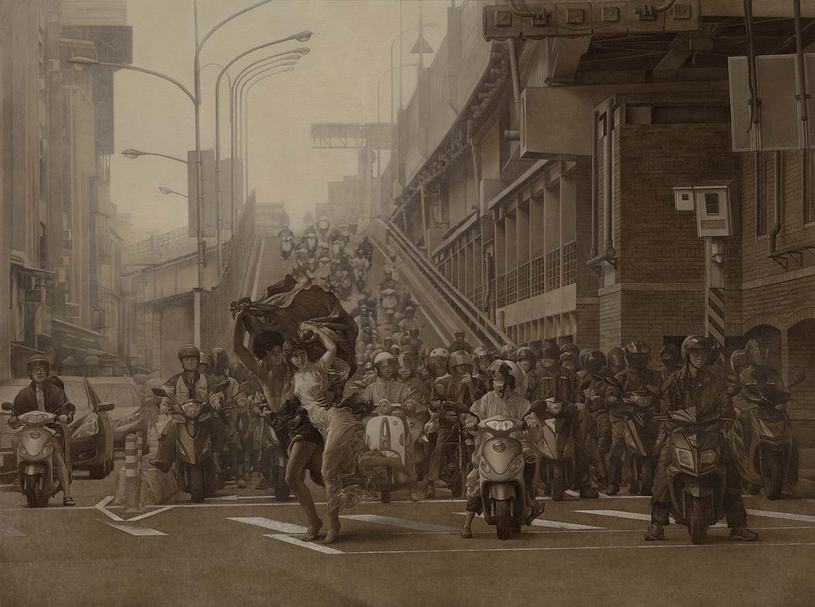 於是超現實、魔幻、社會批判、歷史解構…等等,非現代性的社會與藝術觀念,就這麼伴隨著「寫實」技法的視覺表現形式,進入台灣當代藝術的場景中。