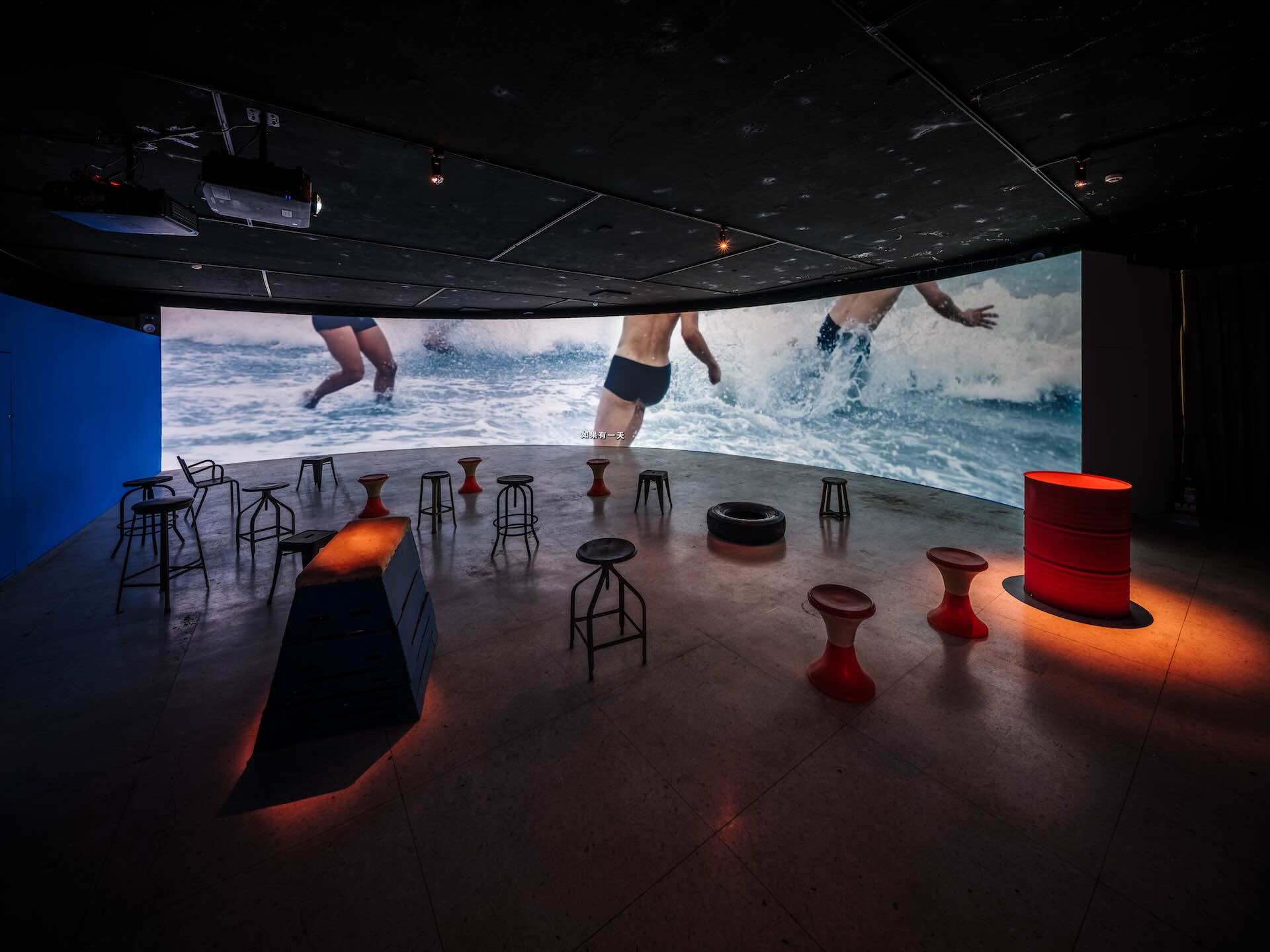 文博會主題館「野性博物館」的第五展間「團練巨幕廳」的八分鐘超寬銀幕影片,是由紀錄片導演Adiong LU近身跟拍,捕捉臺灣創作者眼神發光、身體野放的時刻。(2023臺灣文博會提供)
